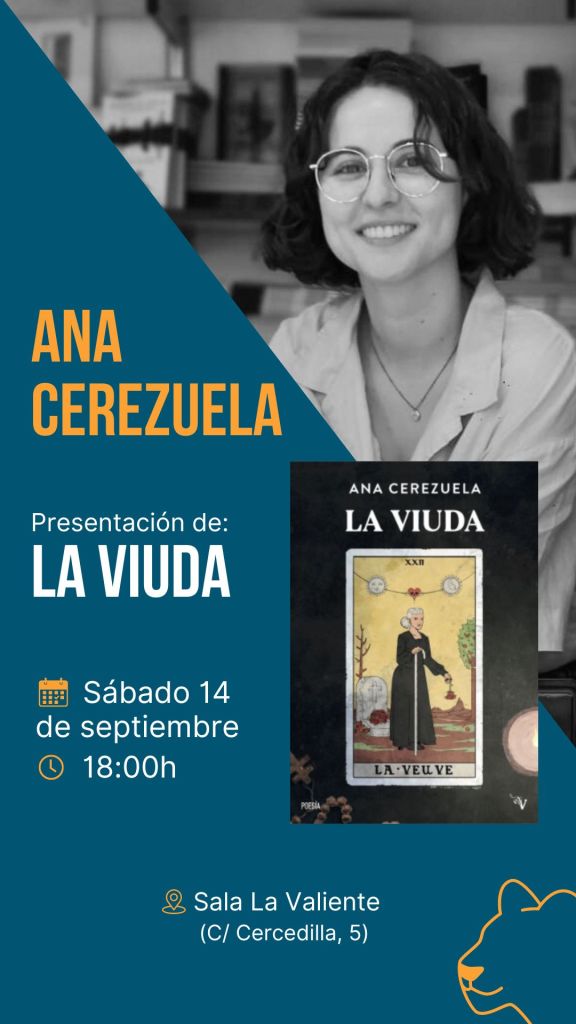 Se acabó el verano y vuelvo a Madrid! Presento allí la semana que viene mi cuarto poemario, La viuda. Será el próximo sábado, 14 de septiembre, a las 18:00 en la sala La Valiente (c/ Cercedilla, 5). Me acompañará mi amiga Abbey C, hablaremos largo y tendido del libro y habrá espacio para firmas y conversaciones después. Si aun no lo tenéis, podréis comprarlo allí mismo.